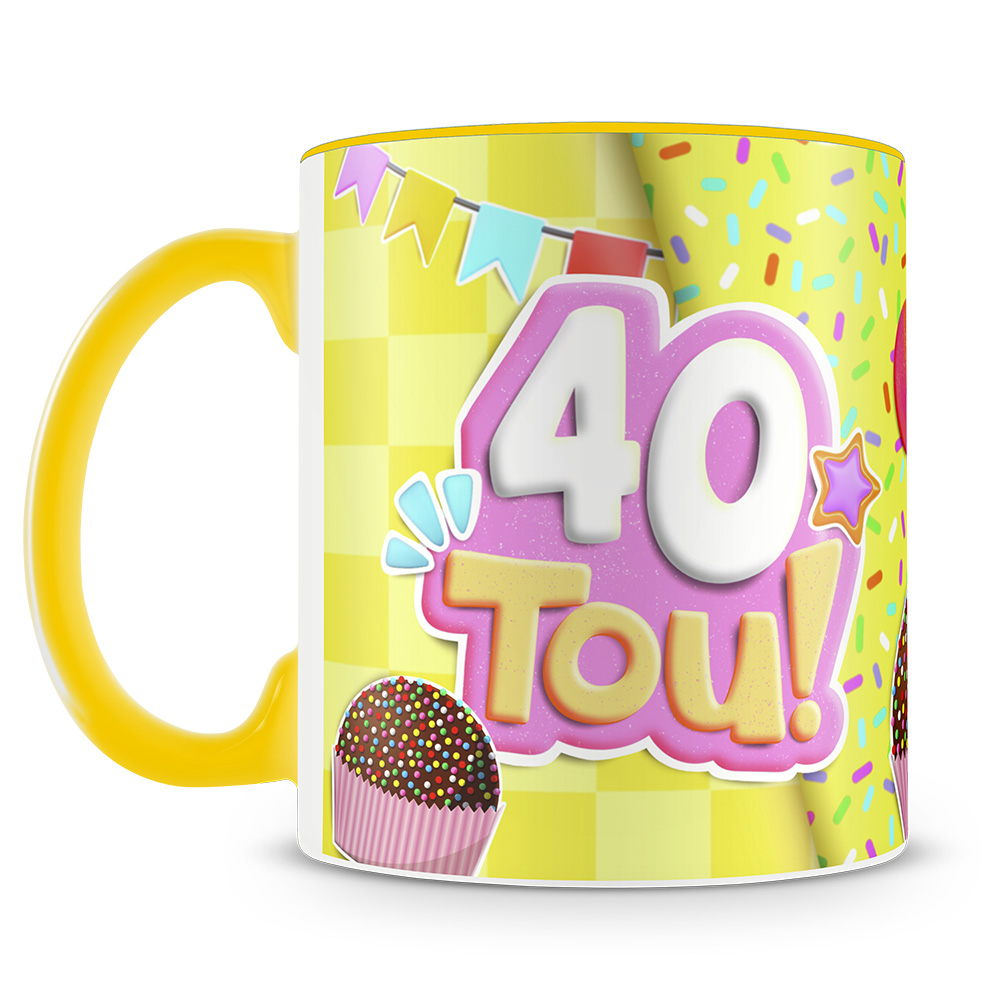 A caneca vai embalada em uma linda caixinha estampada para presente, pronta para surpreender e emocionar no aniversário de 40 anos.