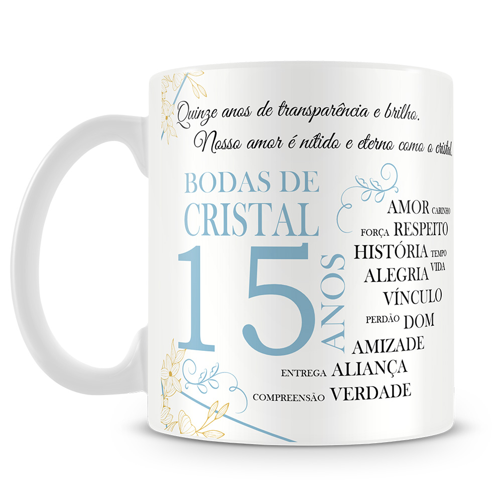 A Caneca Bodas de Cristal é a escolha perfeita para presentear em uma data tão marcante, celebrando os 15 anos de casamento com carinho, significado e emoção.