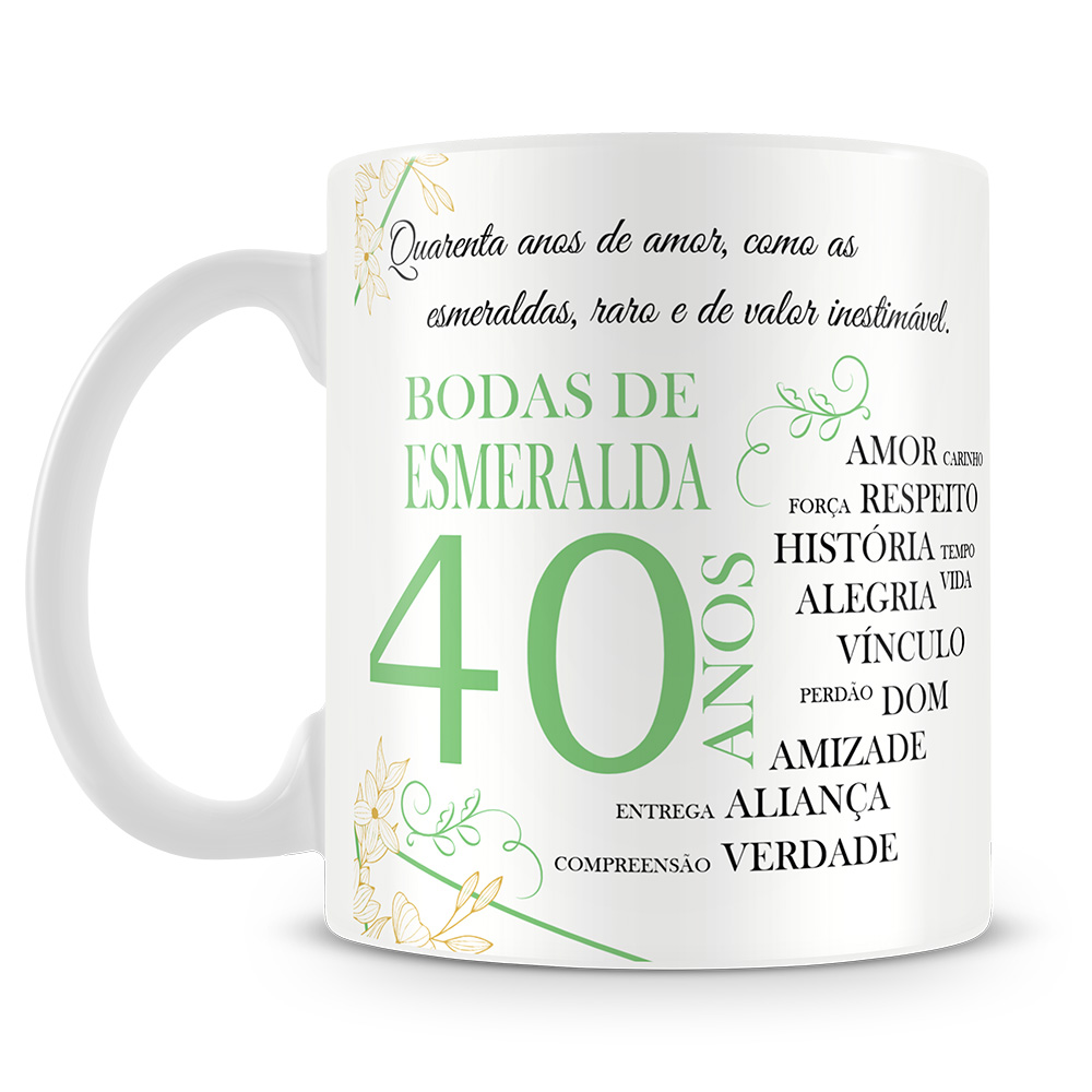 A Caneca Bodas de Esmeralda é a escolha perfeita para celebrar os 40 anos de casamento, uma data marcante que simboliza um amor forte, valioso e cheio de história.