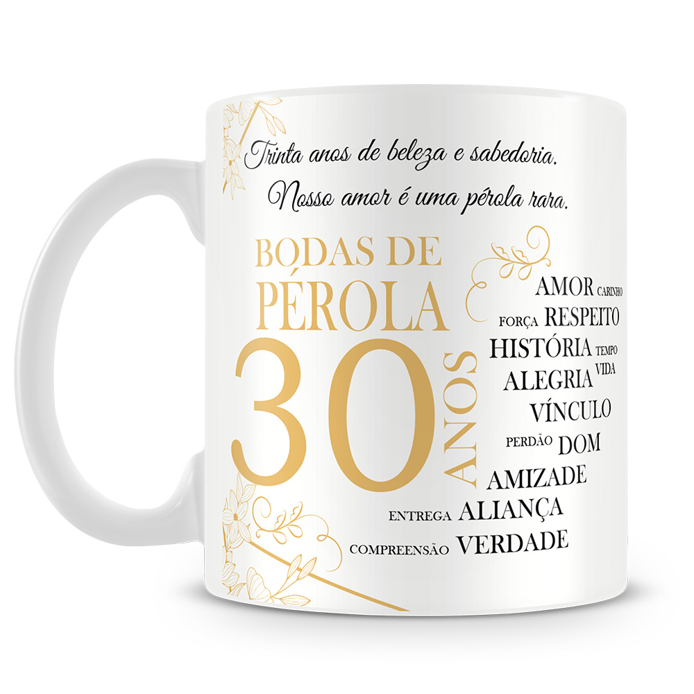 A Caneca Bodas de Pérola é a escolha perfeita para celebrar os 30 anos de casamento, uma data marcante que simboliza um amor precioso, maduro e cheio de histórias compartilhadas.