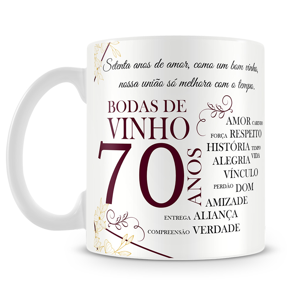 A Caneca Bodas de Vinho é a escolha perfeita para celebrar os 70 anos de casamento, uma data rara e emocionante que simboliza um amor maduro, valioso e cheio de história.